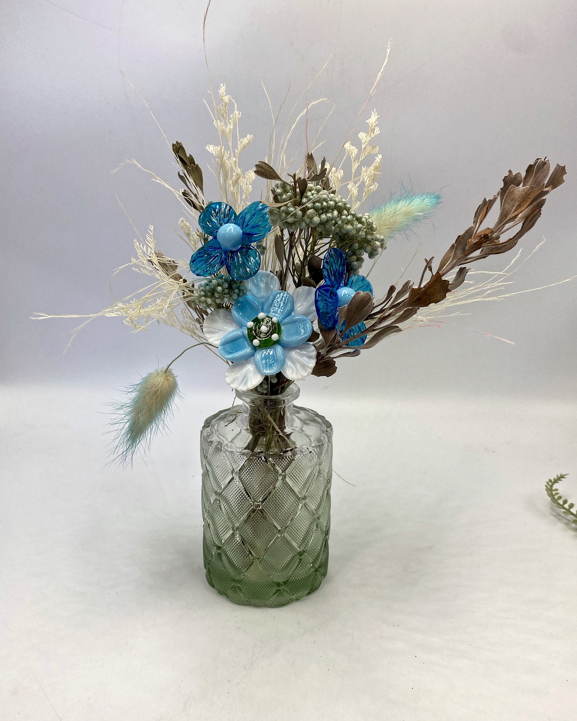 Three flame-sculpted glass flowers in fresh aqua, crisp white, and zesty lime — paired with preserved dried florals for a burst of wild abundance. Each petal is shaped by hand in my Perth studio using the ancient art of lampworking, then gathered in a green-toned transparent vase with a textured finish. Note: The vase shape/type may differ from the one pictured.