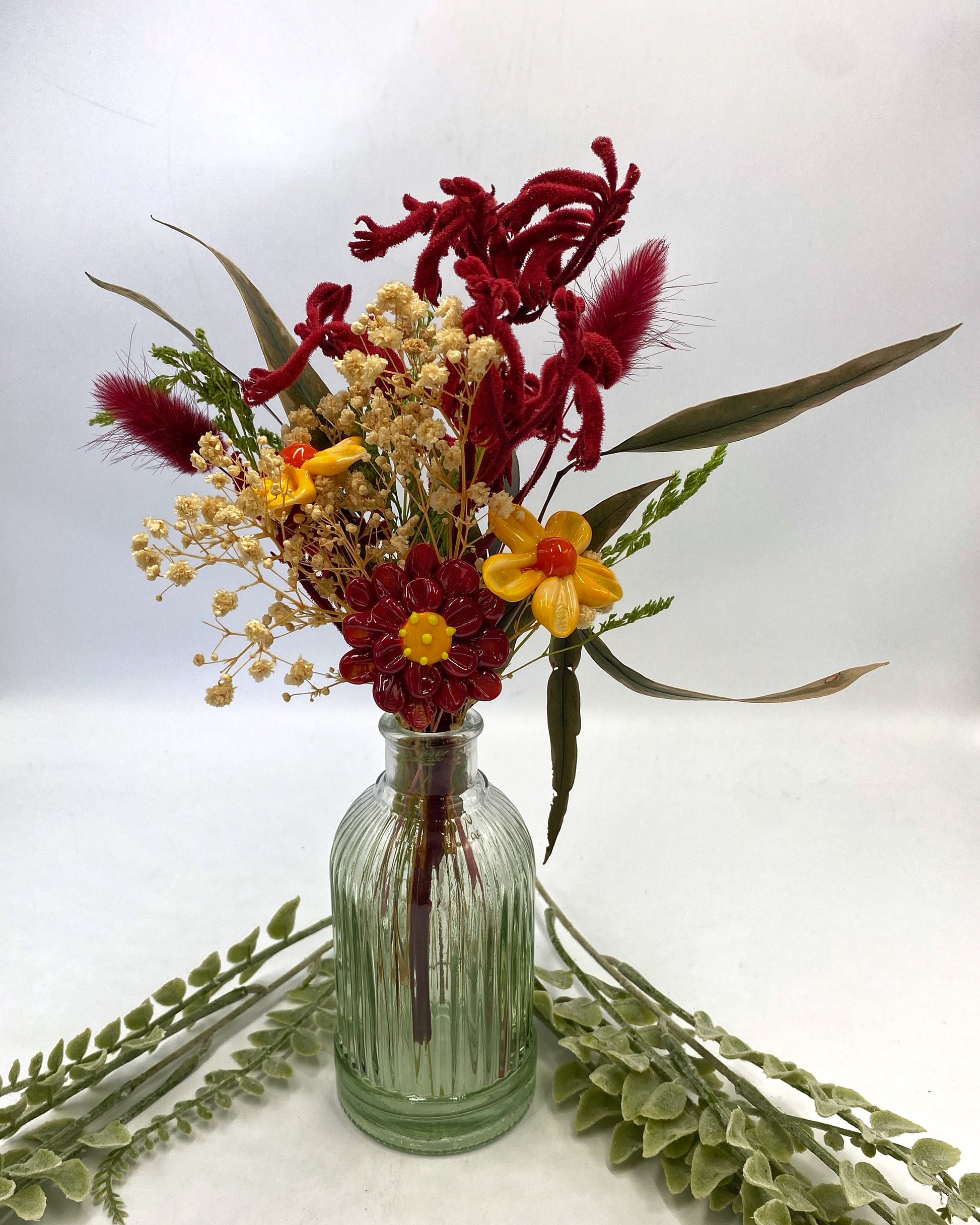 This bold trio of flame-forged glass flowers is paired with preserved florals — including iconic Australian kangaroo paw — in a green-toned, textured vase.