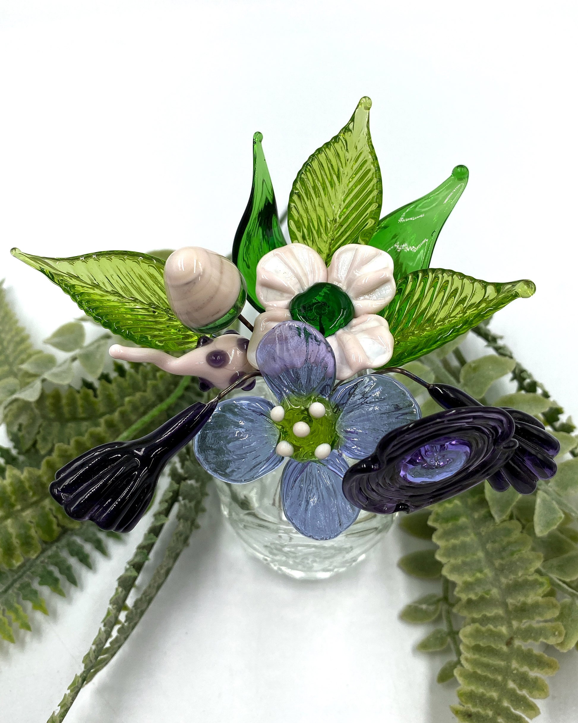 A gentle palette of soft lavenders, purples and pale pinks, handcrafted to honour quiet beauty and enduring love. The three main flowers are made with cremains delicately suspended in molten glass centres - a meaningful keepsake that feels both peaceful and personal.