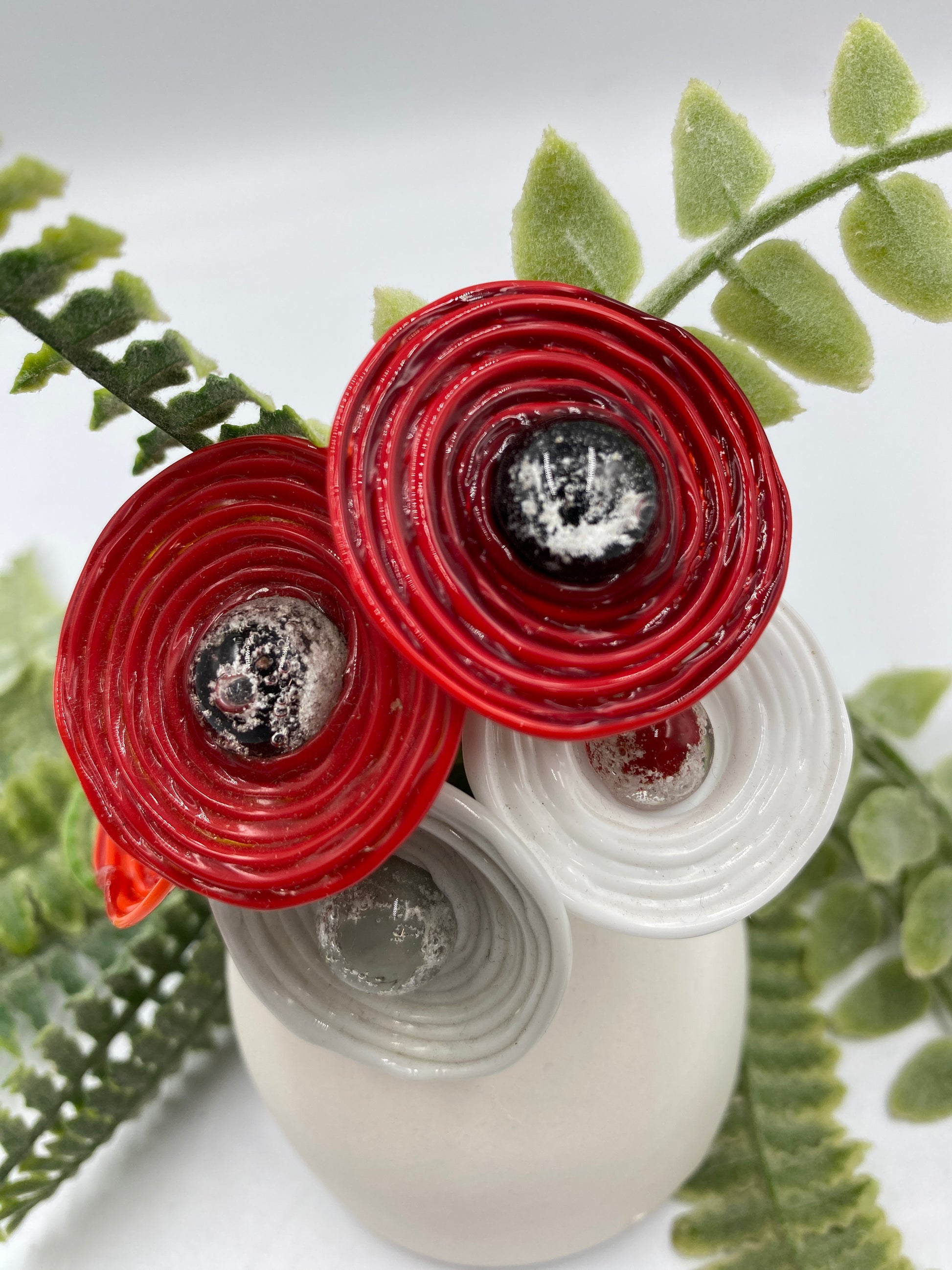 I have been making glass flowers since 2012 and create every glass stem by hand in my studio in Perth, West Australia. I melt coloured glass rods in a torch flame, and build each piece directly onto stainless steel wire. I use gravity and tools to sculpt flowers, leaves and my quirky character plant stakes. Every piece is kiln annealed for strength and durability before being carefully inspected, cleaned and arranged into the final piece.
