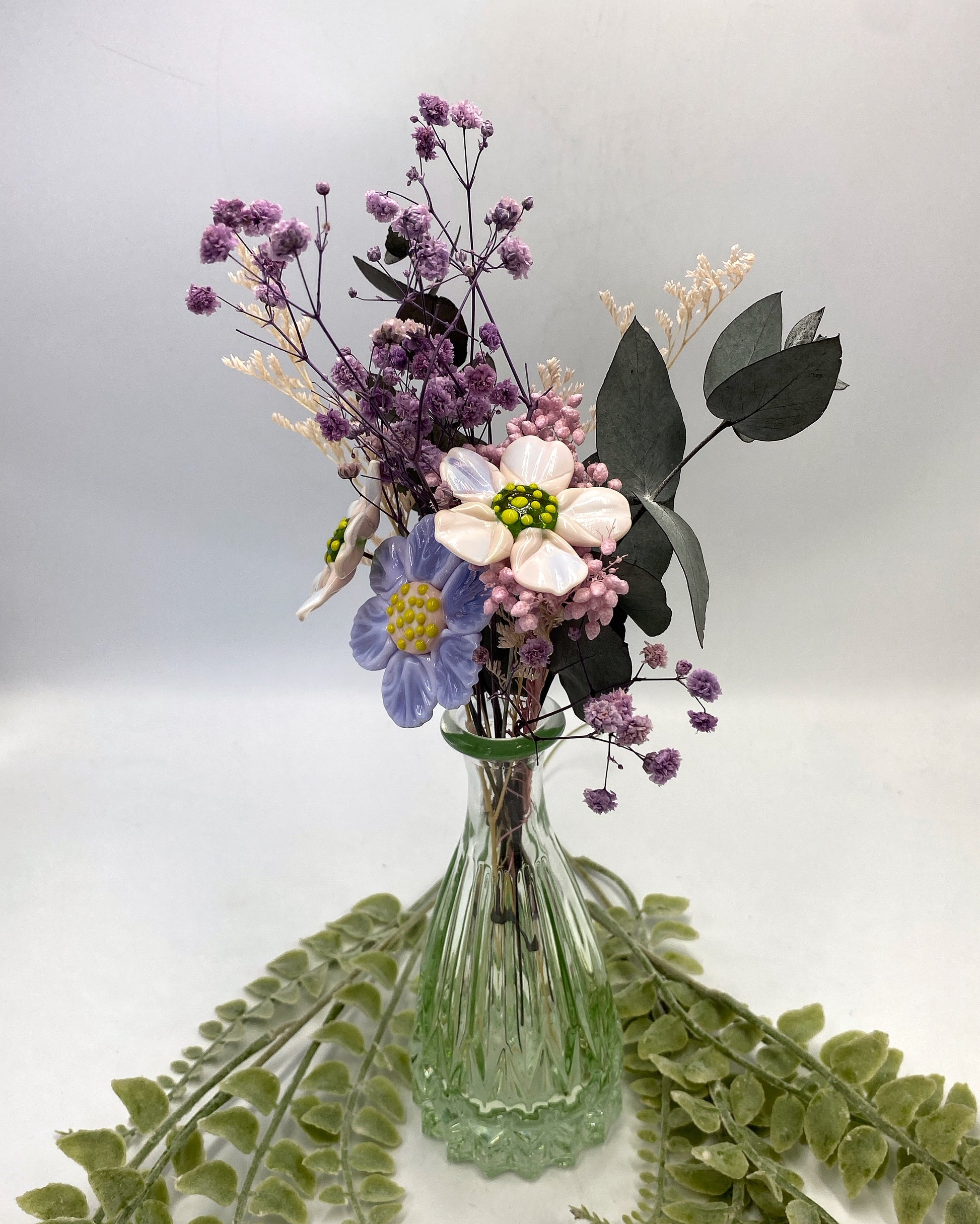 3 individully crafted glass stems per vase, with a carefully selected arrangement of preserved/dried flowers and foliage.