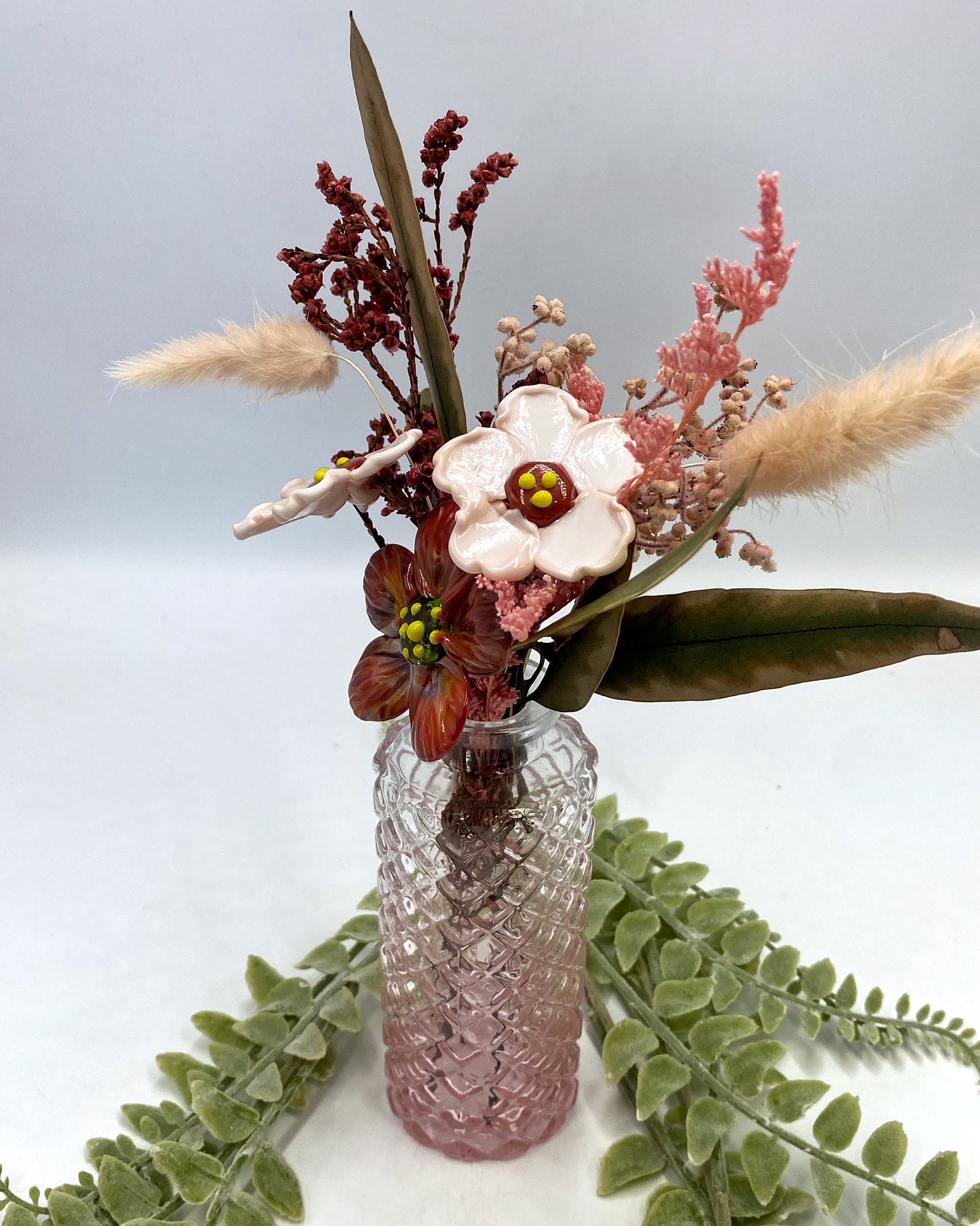 Bold orange-red meets soft blush pink in this fiery-meets-floral trio. Each glass flower is handcrafted in flame, with subtle mottling and glowing colour shifts, then arranged with preserved botanicals — including fluffy bunny tails — in a textured pink-toned vase.
